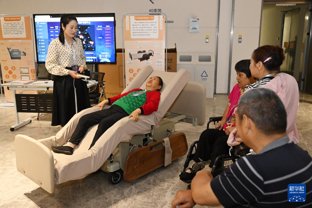 5月19日,在合肥市科技馆举行的安徽省科技助残产品展演荟现场,残障人士体验一款多功能康复智能床产品。