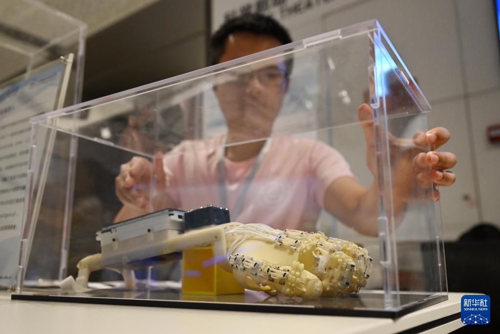 5月19日,在合肥市科技馆举行的安徽省科技助残产品展演荟现场,参展企业工作人员展示一款手功能康复机器人产品。