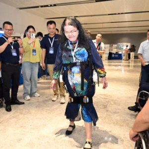 5月19日,在合肥市科技馆举行的安徽省科技助残产品展演荟现场,残障人士体验一款轻质下肢助力助行外骨骼机器人产品。