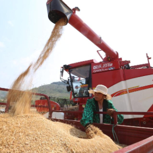 5月19日,在山东省枣庄市山亭区凫城镇文王峪村,农民在收割小麦。