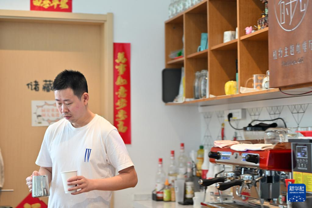 刁文超在天津市西青区的咖啡厅内工作(5月16日摄)。今年37岁的刁文超是一位听障人士,他现在是创美助残基地的咖啡师。来到创美助残基地后,刁文超在同事的帮助下开始学习制作咖啡,并逐渐能够独立接待客户,语言能力也得到提升。