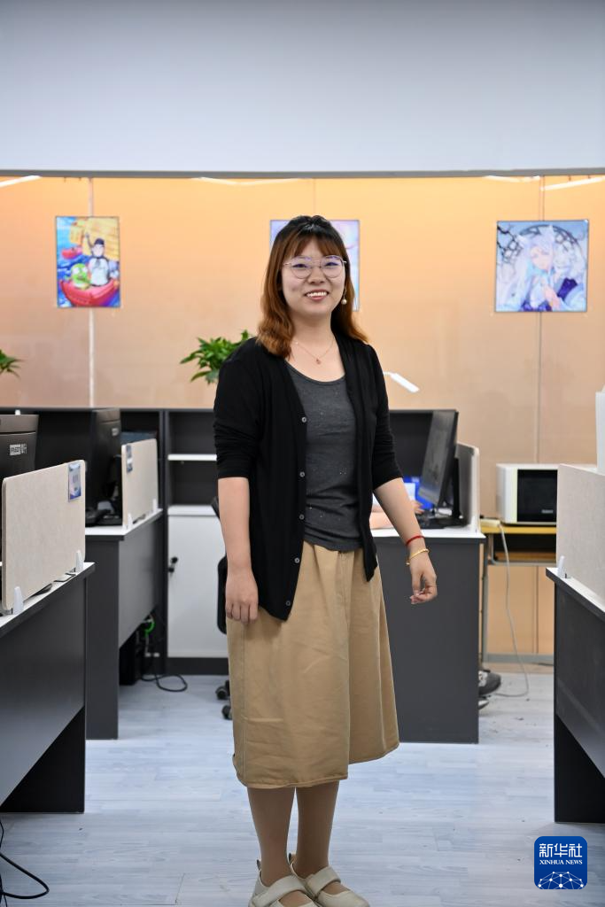牛富佳在天津市南开区悦动广场的办公地上班(5月17日摄)。今年24岁的牛富佳小时候因车祸失去了左腿,她现在是创美助残基地的动漫设计师。牛富佳曾在全国第七届残疾人职业技能大赛上获优秀技能奖,她在工作中乐观开朗,是基地的优秀员工。