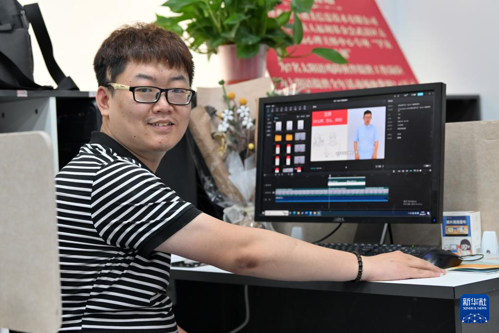 王超凡在天津市南开区悦动广场的办公地上班(5月17日摄)。今年28岁的王超凡是一位脑瘫青年,他现在负责创美助残基地的新媒体运营。王超凡热衷于学习各种后期制作软件,有着不错的文字功底和视频剪辑技术,平时还喜欢拍照,他很享受现在的工作。