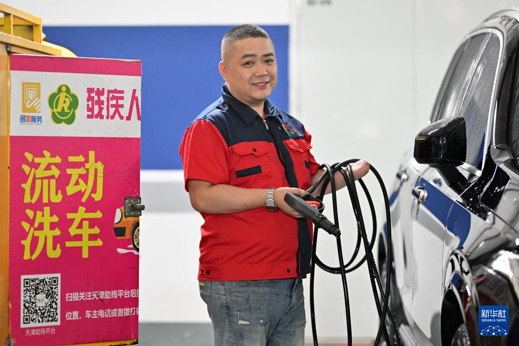 宋磊在天津市西青区新城市中心的地下停车场为客户洗车(5月16日摄)。今年40岁的宋磊在十多年前因为意外失去了左手,他现在是创美助残基地洗车组的组长。宋磊的愿望是将现有的流动洗车搬到店面运营,扩大经营业务。