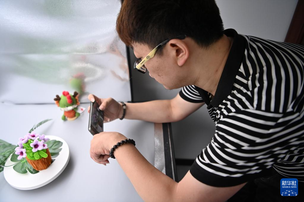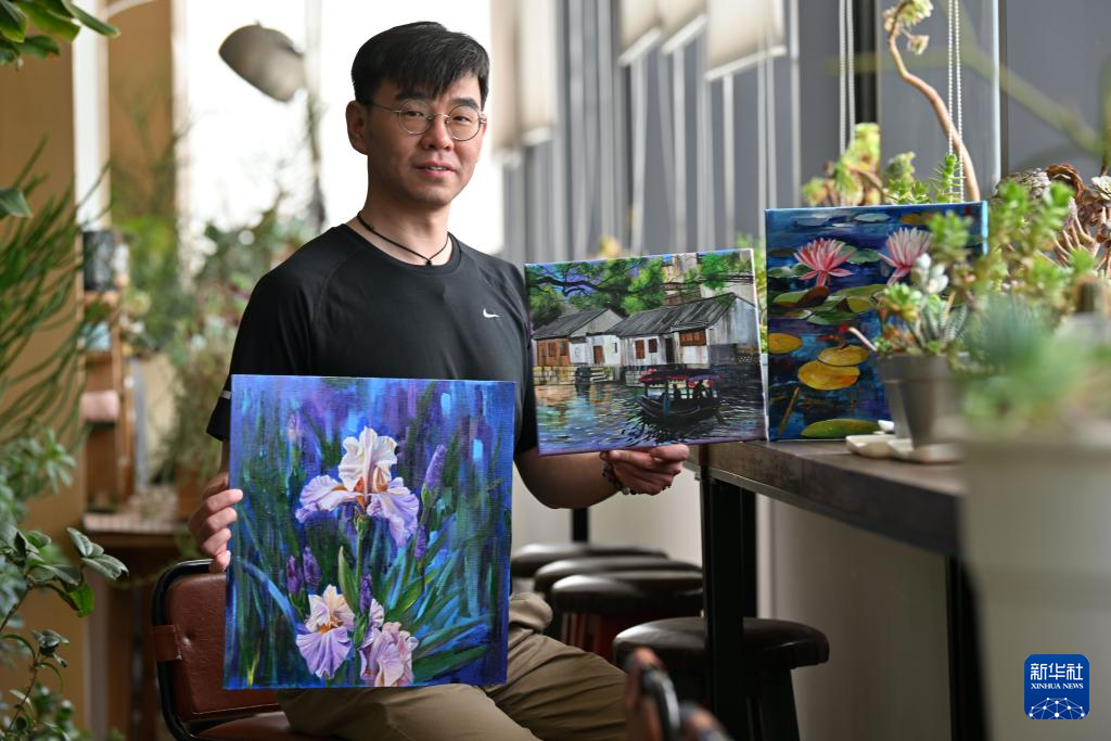赵鹏在天津市西青区的商业公寓内进行绘画工作(5月16日摄)。今年40岁的赵鹏是一位听障人士,他现在是创美助残基地的彩绘画师,赵鹏最大的愿望便是能举办画展。