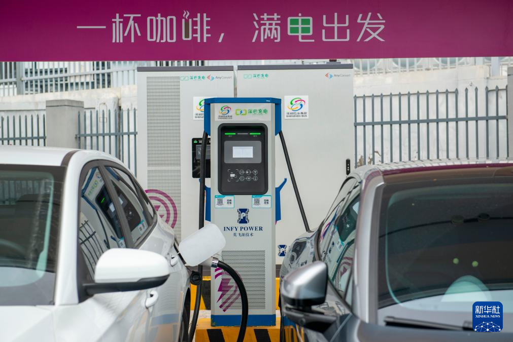5月19日,在位于深圳巴士集团深康充电站内的超充站,两辆新能源汽车正在充电。