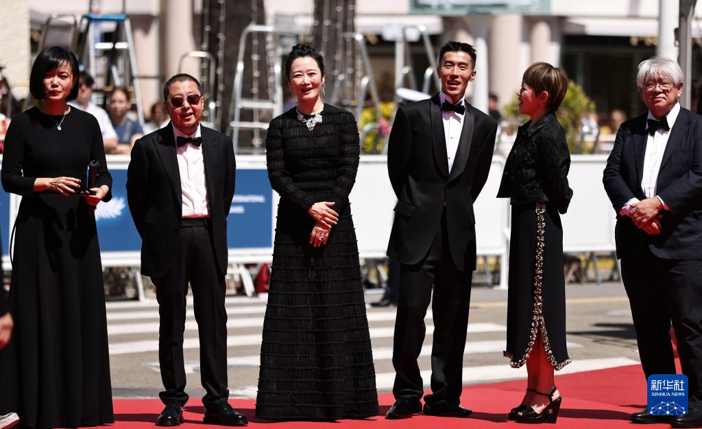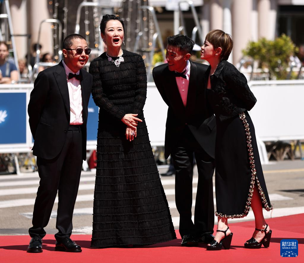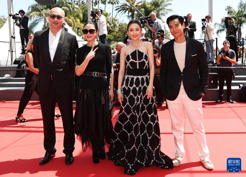 5月18日,在法国南部小城戛纳举行的第77届戛纳国际电影节上,影片《风流一代》导演贾樟柯(左二)携主创出席首映礼。