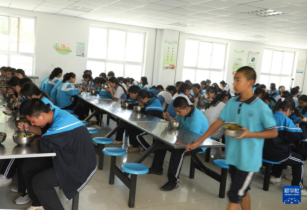 5月17日,学生在甘肃省平凉市崆峒区崆峒初级中学食堂用餐。