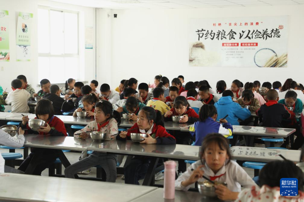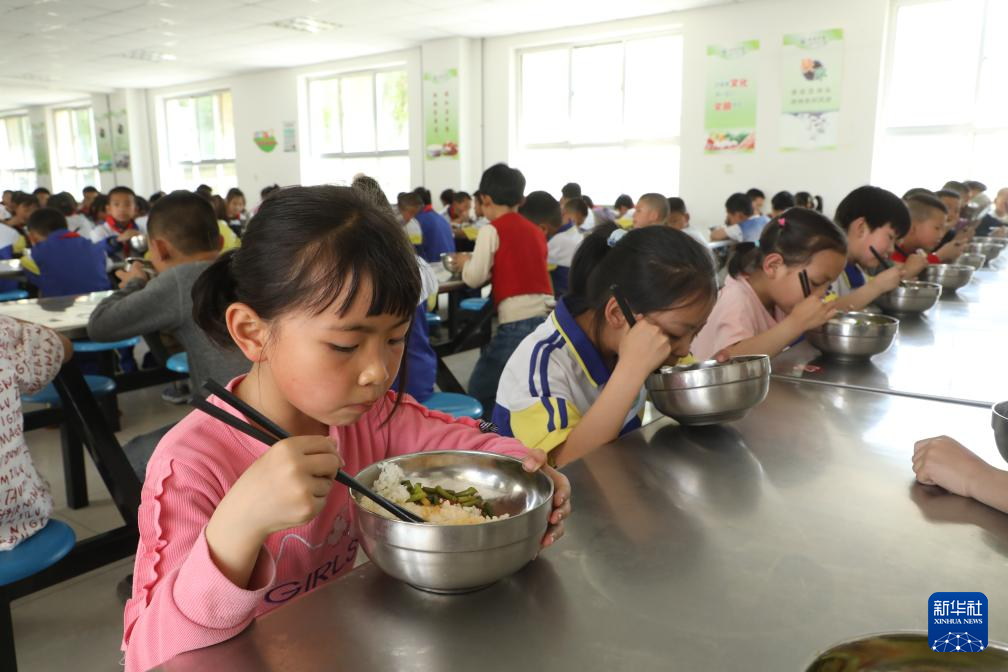 5月17日,学生在甘肃省平凉市崆峒区寨子街中心小学食堂用餐。