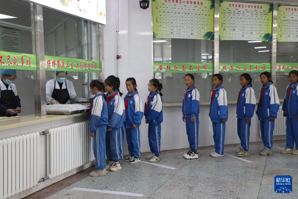 5月20日,在甘肃省甘南藏族自治州合作市第五小学食堂,学生排队领取营养早餐。