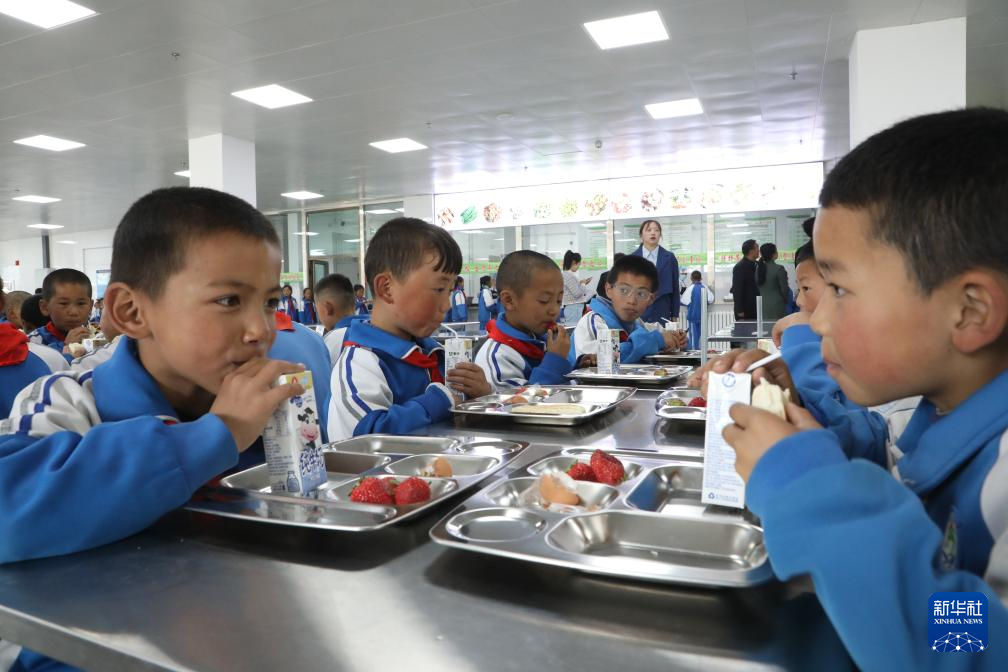5月20日,在甘肃省甘南藏族自治州合作市第五小学食堂,学生在吃营养早餐。