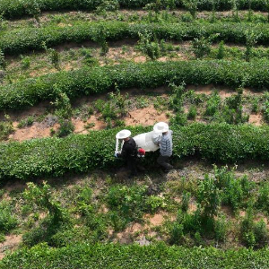 5月20日,茶农用采茶机在江苏省镇江句容市下蜀镇窑业茶场采收夏茶(无人机照片)。