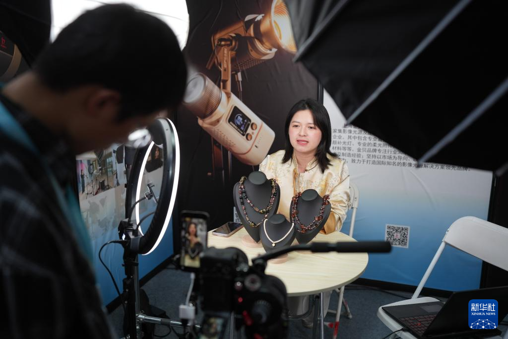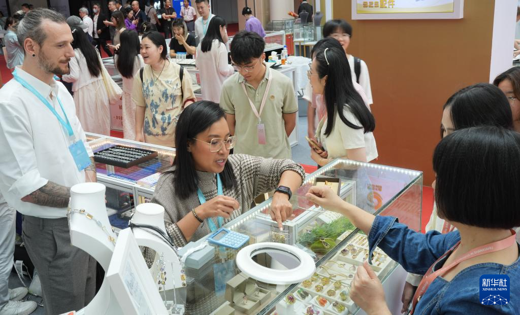 5月20日,一家来自泰国的展商向参观者介绍珠宝饰品。