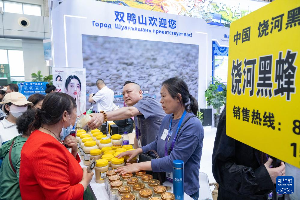 5月20日,在第八届中俄博览会现场,参观者选购来自黑龙江双鸭山的黑蜂椴树蜜。