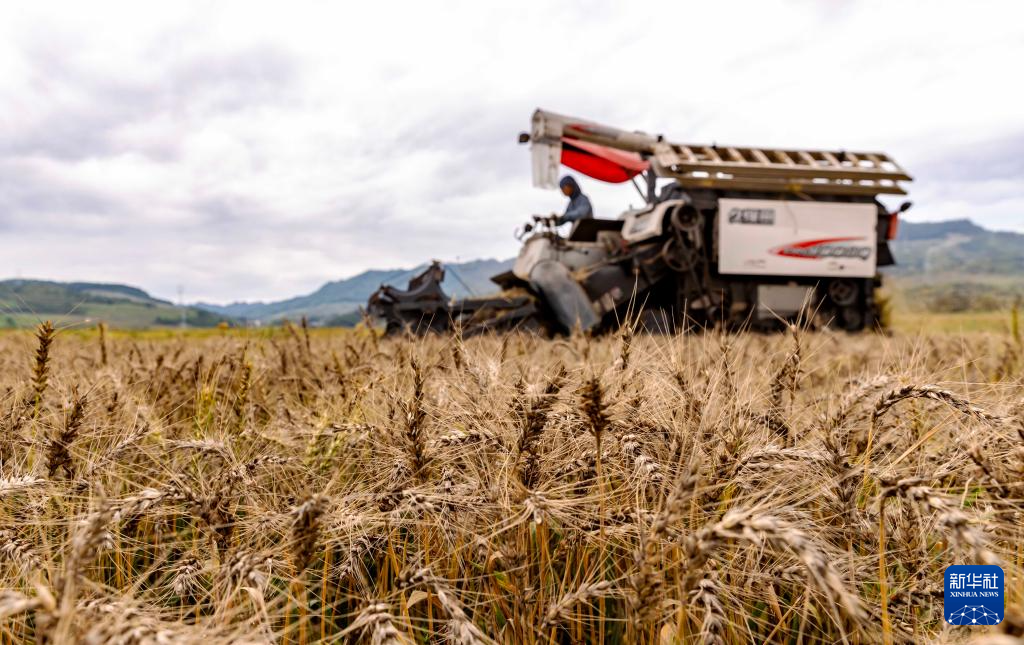 5月20日,农机手驾驶收割机在贵州省黔西市重新镇田间收割小麦。