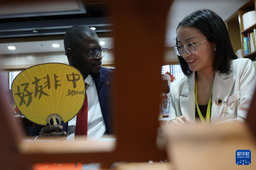 当日,参加第八届中非青年大联欢活动的中非青年代表走进位于北京的中国宋庆龄青少年科技文化交流中心,体验印染、刺绣、书法等多种民俗,感受中国传统文化的魅力,在交流互动中增进友谊。