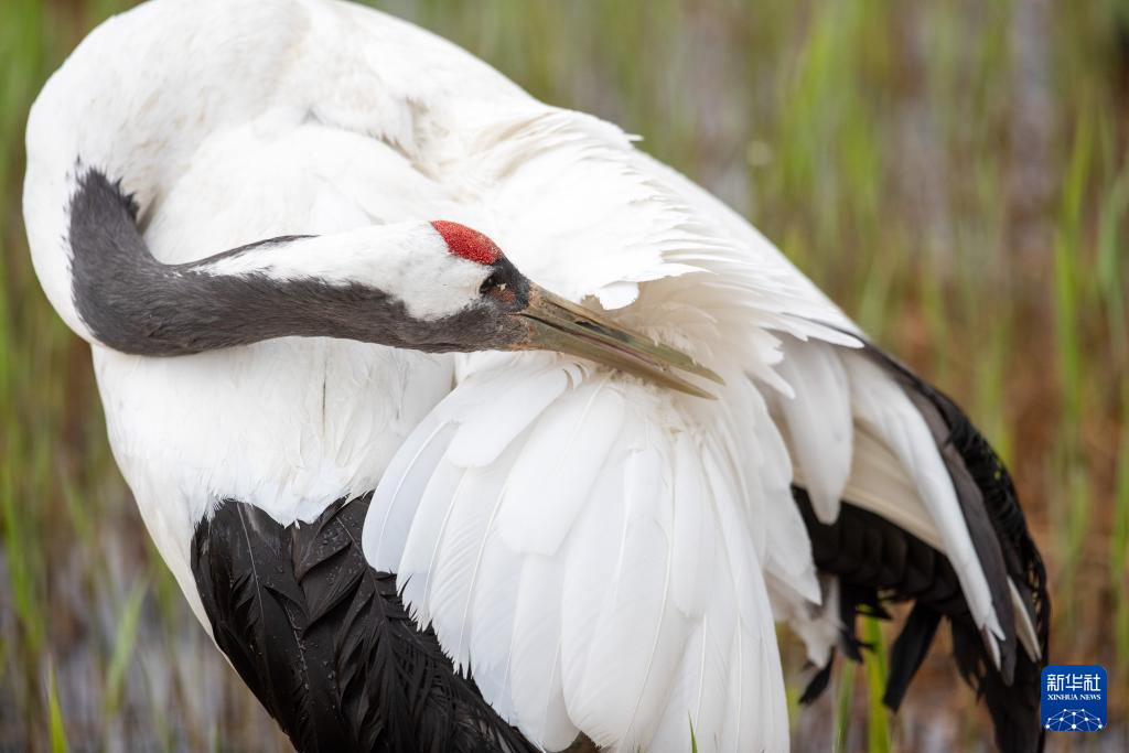 5月21日,在扎龙国家级自然保护区,丹顶鹤在整理翅膀羽毛。