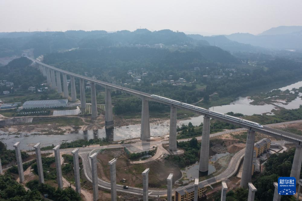 一列调试列车经过巴南高铁恩阳河大桥(无人机照片,5月16日摄)。