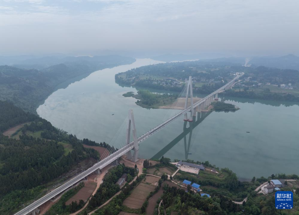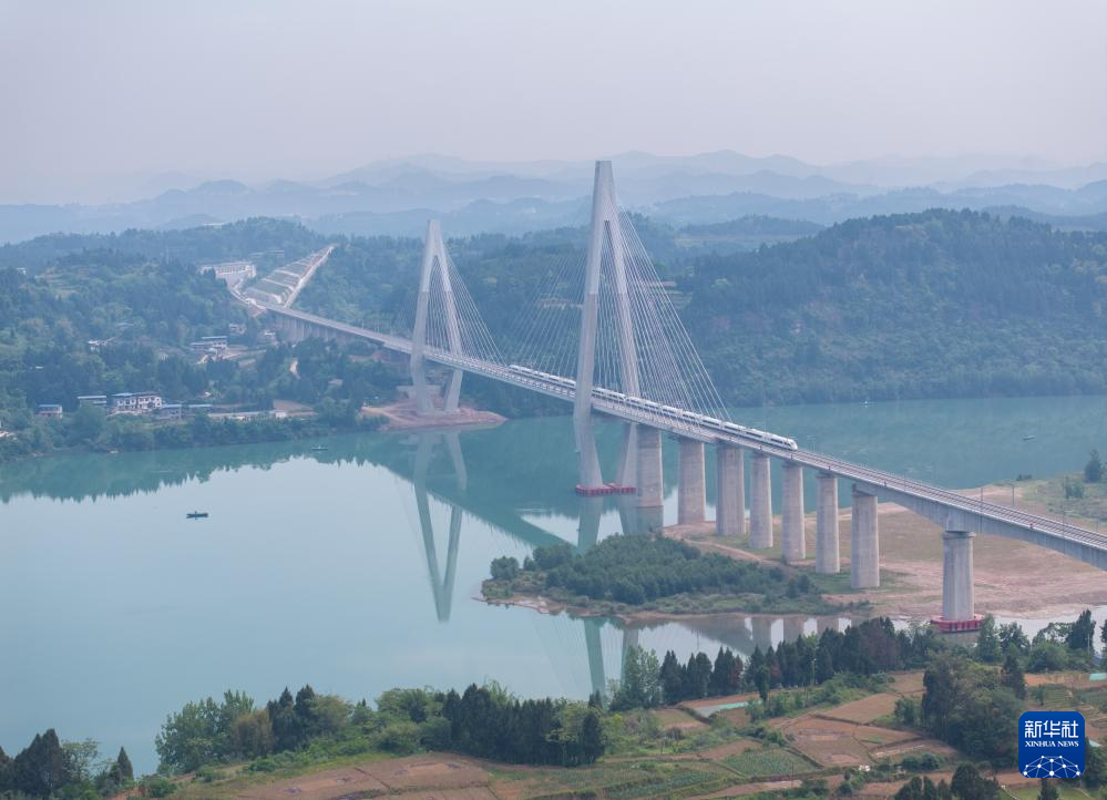一列调试列车经过巴南高铁嘉陵江大桥(无人机照片,5月15日摄)。