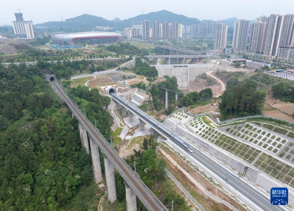 一列调试列车经过东华山隧道口,该隧道上方是巴中市体育中心(无人机照片,5月16日摄)。