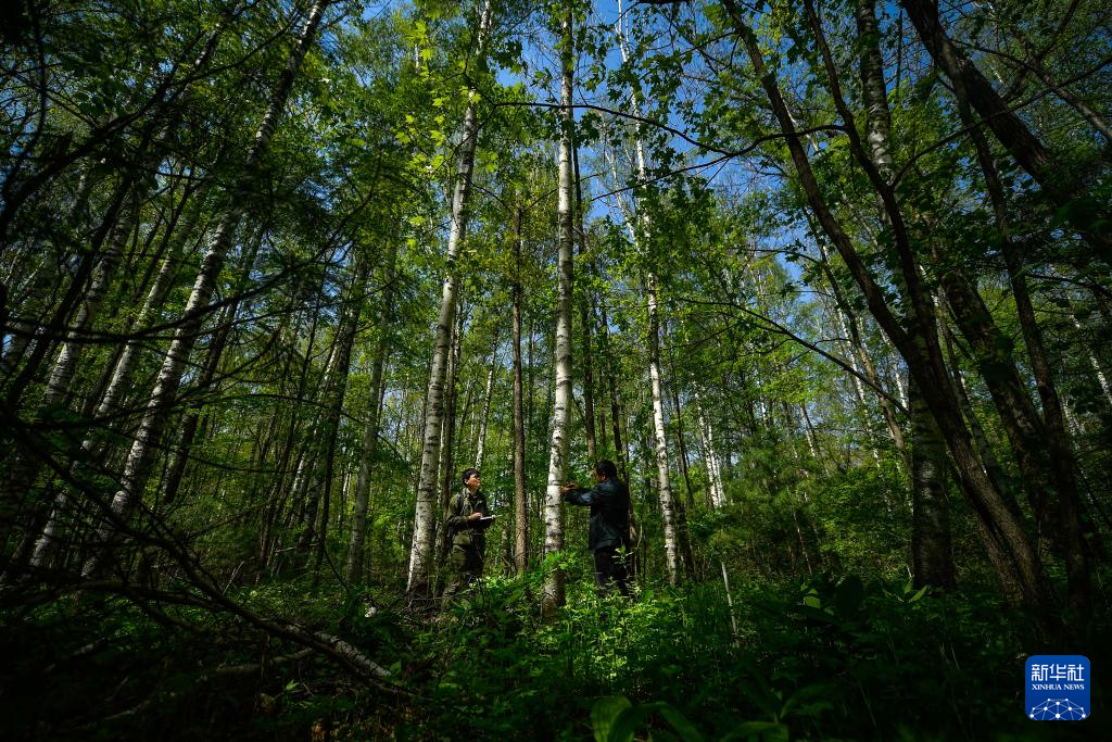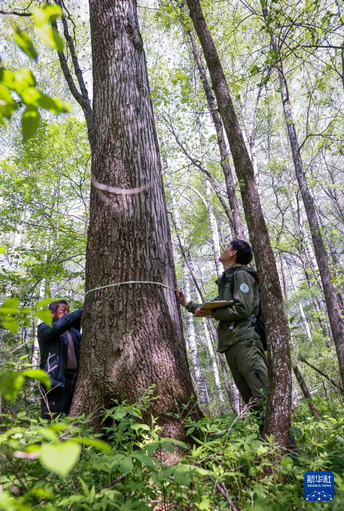 贾翔(左)和工作人员赵路福在长白山国家级自然保护区的植物固定监测样地测量记录树木生长数据(5月9日摄)。