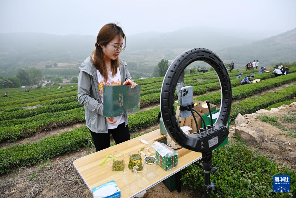 进入茶叶采摘和销售旺季,山东省日照市的茶园里处处可见茶工忙碌采茶的身影,还有许多主播将网络直播间搬到茶园,就地进行直播推介。据介绍,日照市茶叶种植面积约30万亩,年总产值近40亿元,形成了巨峰镇、后村镇、夏庄镇、潮河镇等茶叶特色镇,带动当地30余万人就业。