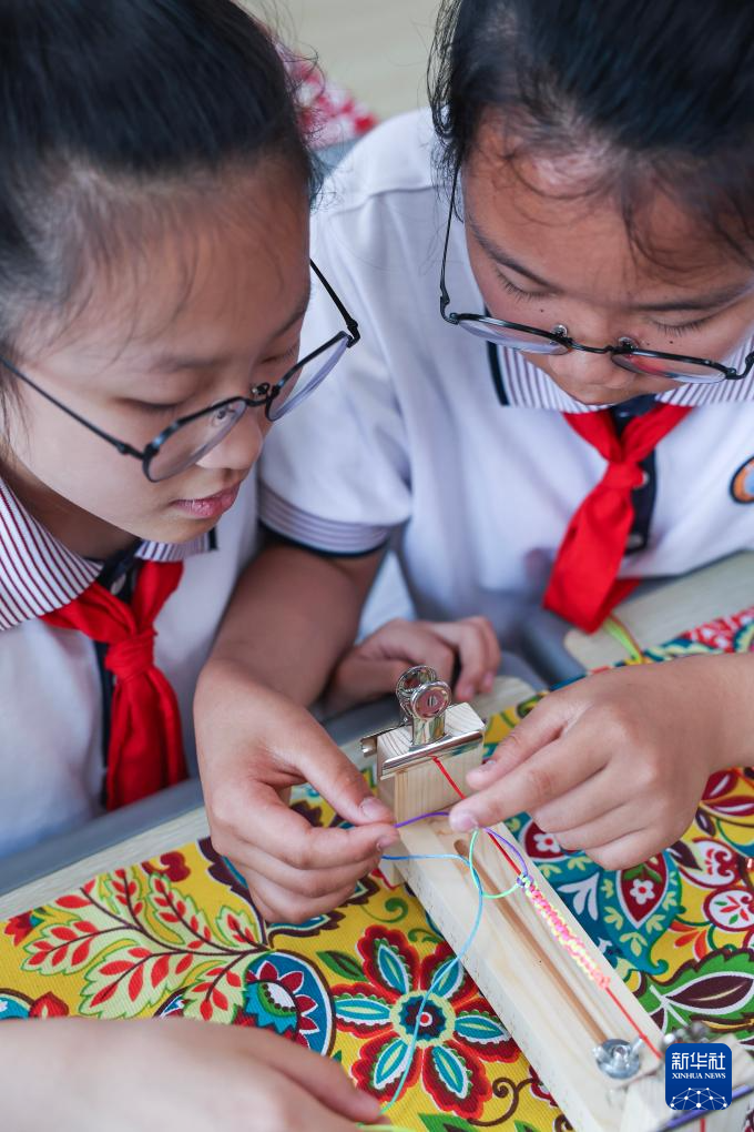 5月22日,太湖小学的学生们在特色课程上学习端午“五彩绳”的编织。