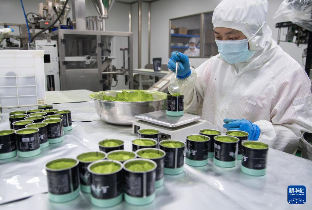 5月22日,在湖北省孝感市大悟县金墩村湖北半兵卫茶业有限公司生产车间,工作人员在分装抹茶粉。