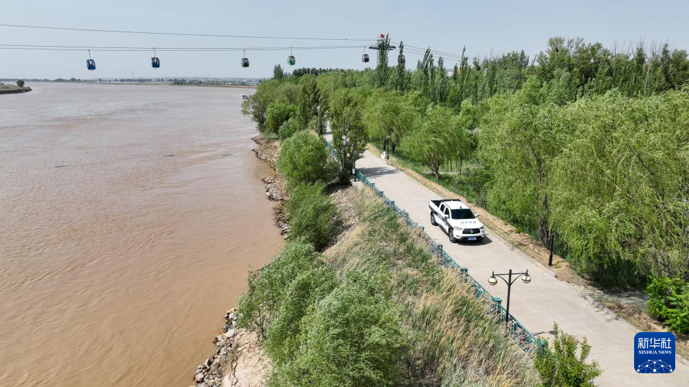 5月22日,工作人员在内蒙古呼和浩特市托克托县神泉生态旅游风景区检查黄河堤坝(无人机照片)。