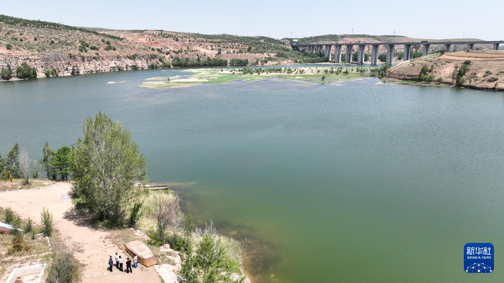 5月22日,工作人员在内蒙古呼和浩特市清水河县当阳桥水库巡查(无人机照片)。