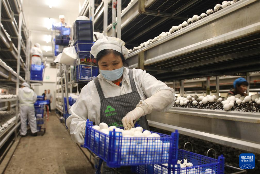5月22日,村民在定远县西卅店镇农产品加工园的菌业生产车间采摘蘑菇。