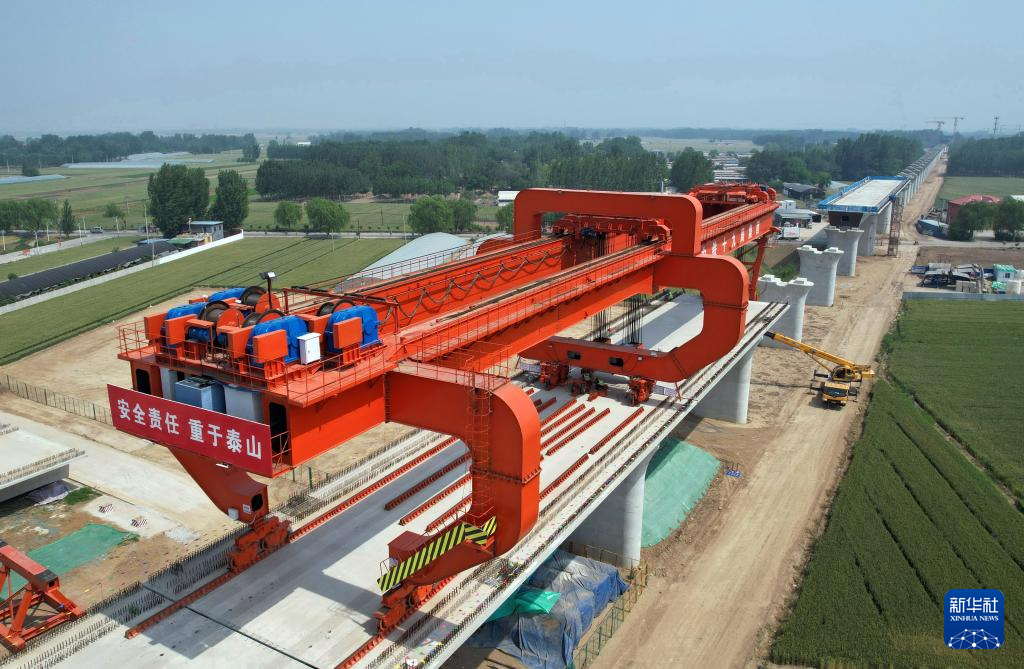 5月23日,中铁十九局的工人在雄商高铁河北段肃宁东站前三标段进行架梁作业。