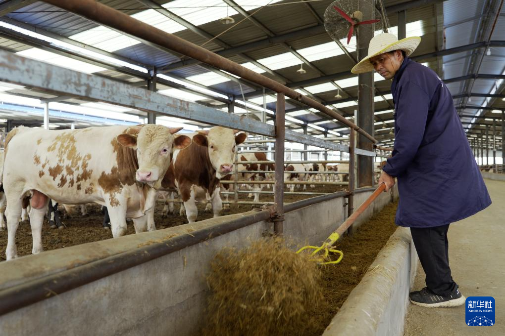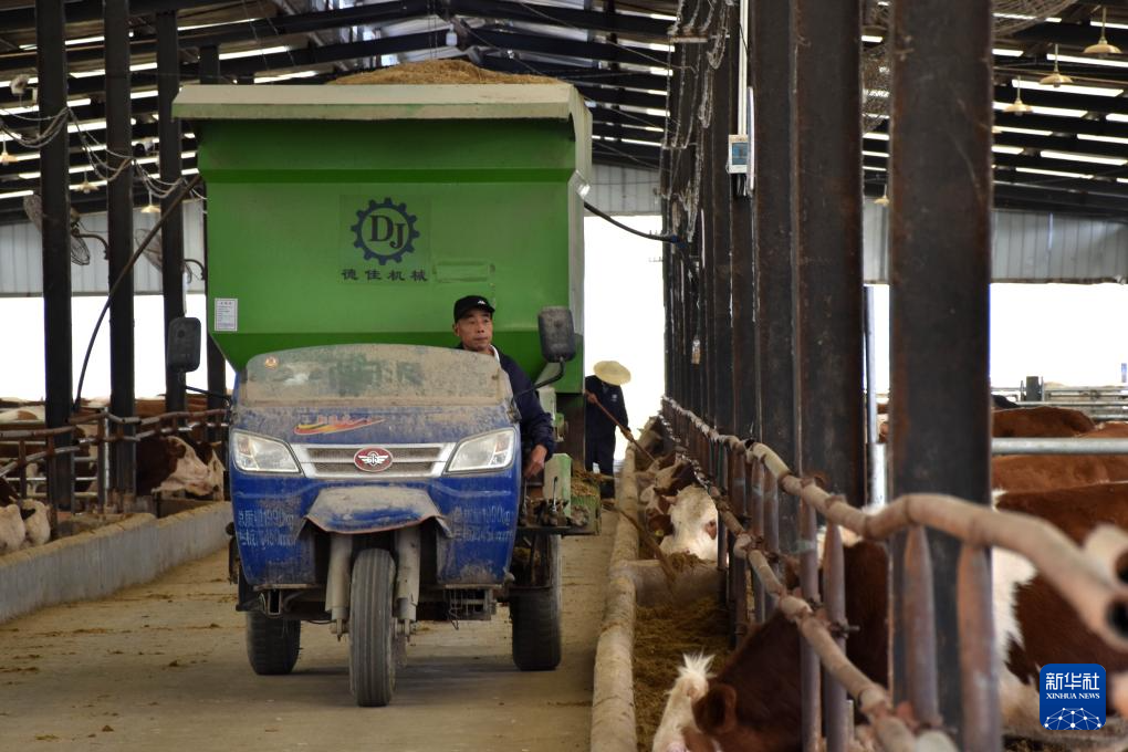 5月20日,工作人员在李寨村养牛场内投放饲料。
