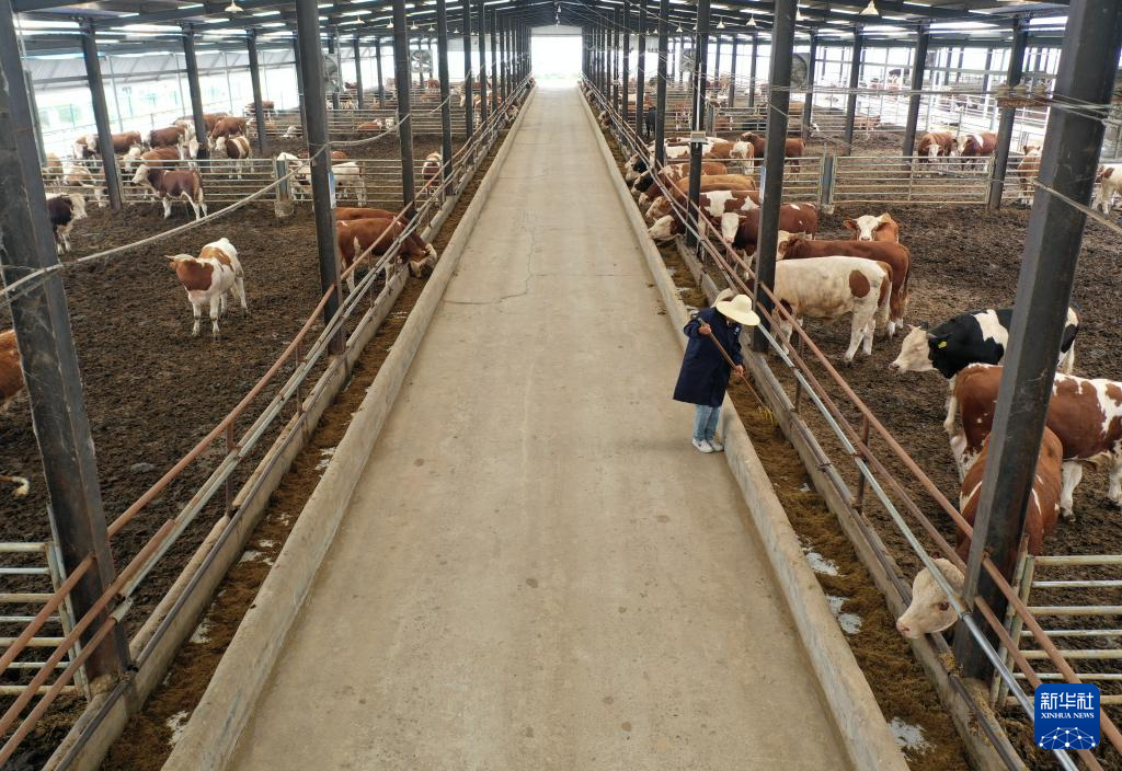 5月21日,工作人员在李寨村养牛场内匀料(无人机照片)。