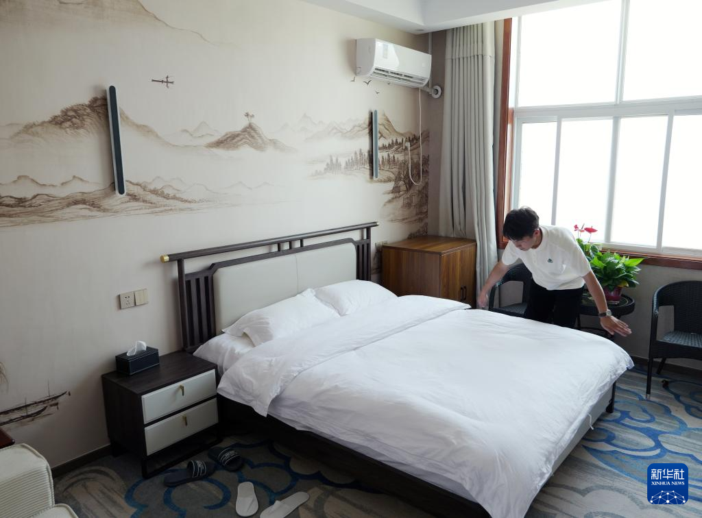 5月20日,工作人员在李寨村康养民宿内整理房间。