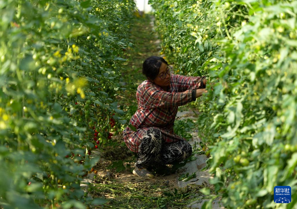 5月20日,村民在李寨村小番茄种植大棚内剪枝。