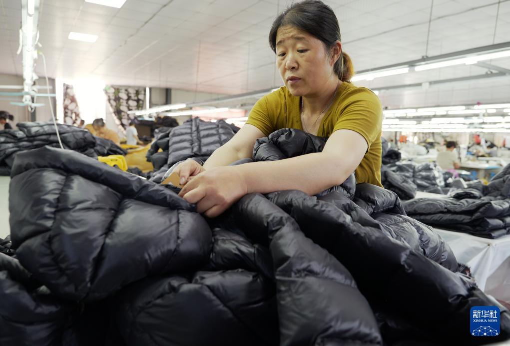 5月20日,村民在李寨村服装加工厂为羽绒服产品系上标牌。