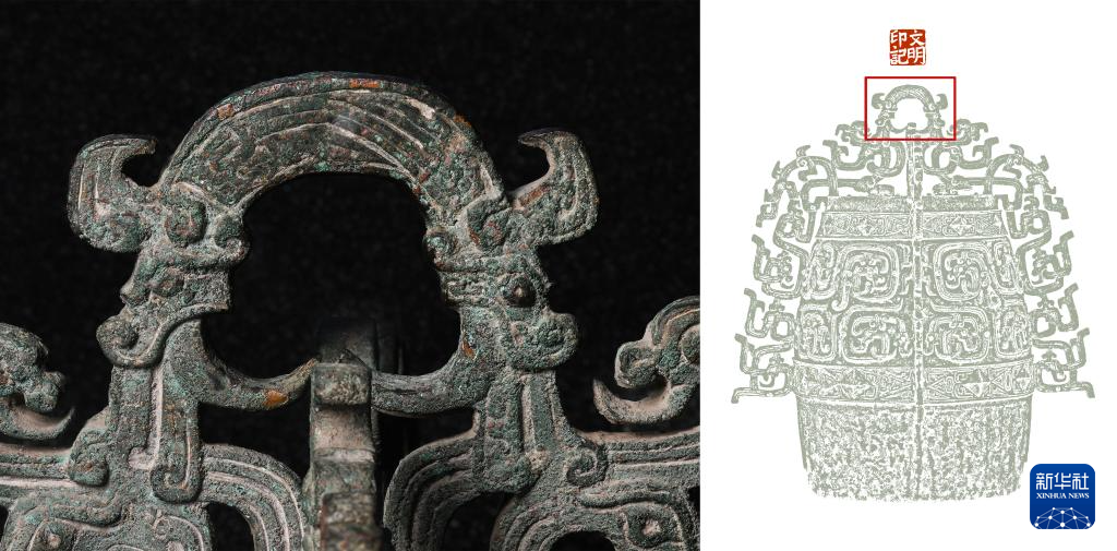 拼版照片,左图:秦公镈(一号镈)“钮”部特写(2024年1月23日摄);右图:左图画面在镈身位置示意图(红框内)。 新华社记者 李贺 制图pagebreak
