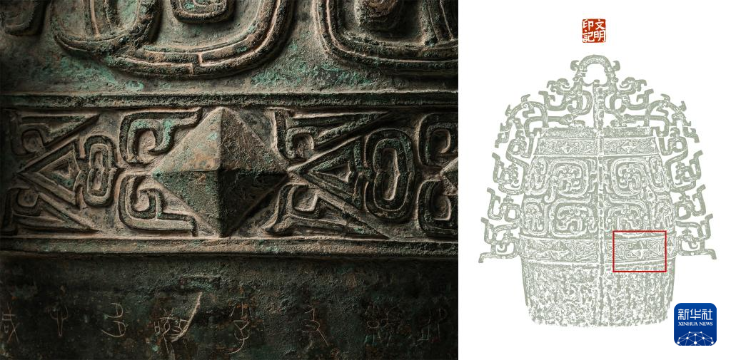 拼版照片,左图:秦公镈(一号镈)“钲”部装饰条带局部和突出的菱形“枚”特写(2024年1月23日摄);右图:左图画面在镈身位置示意图(红框内)。 新华社记者 李贺 制图pagebreak