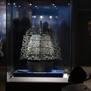 在福建博物院,观众在观赏宝鸡青铜器博物院藏的秦公镈(2022年5月12日)。 新华社记者 魏培全 摄pagebreak