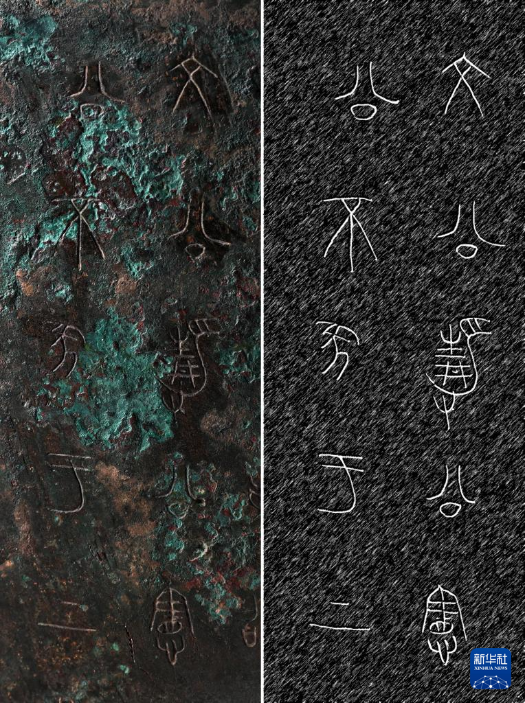 拼版照片,左图:秦公镈(一号镈)铭文中“文公 静公 宪公 不㒸(坠)于上”的刻铭特写(2024年1月23日摄);右图:左图刻铭的复原图。 新华社记者 李贺 制图pagebreak