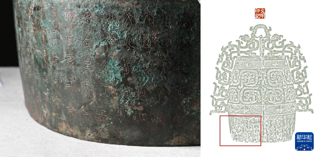 拼版照片,左图:秦公镈(一号镈)“鼓”部刻铭局部(2024年1月23日摄);右图:左图画面在镈身位置示意图(红框内)。 新华社记者 李贺 制图pagebreak