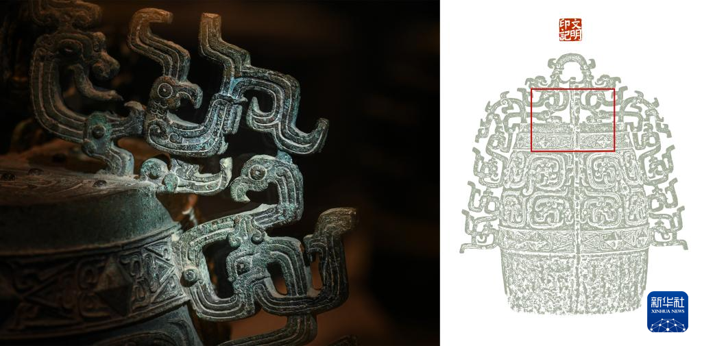 拼版照片,左图:秦公镈(一号镈)“扉棱”上龙纹与凤鸟纹装饰局部(2024年1月23日摄);右图:左图画面在镈身位置示意图(红框内)。 新华社记者 李贺 制图pagebreak
