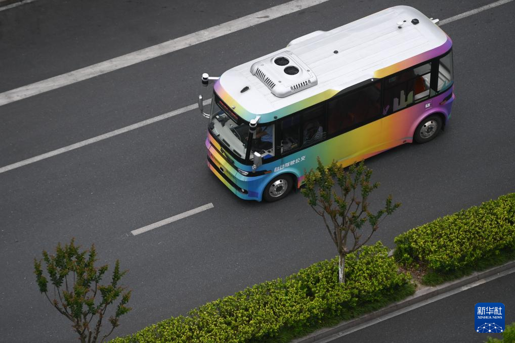2024年5月22日,自动驾驶接驳示范线巴士行驶在浙江省杭州市余杭区未来科技城的道路上。位于浙江省杭州市余杭区的未来科技城自动驾驶接驳示范线是由余杭交投集团投资,海康智联承建。