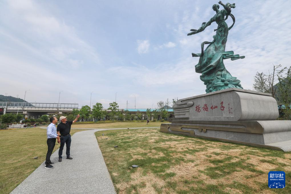 5月22日,在慈溪市横河镇胜路高架梅园互通休闲公园,乡村规划师陈怡(左)与梅园村党总支书记孙炬安在商讨协助梅园村引入桥下烟火市集招商以及体育公园等项目。