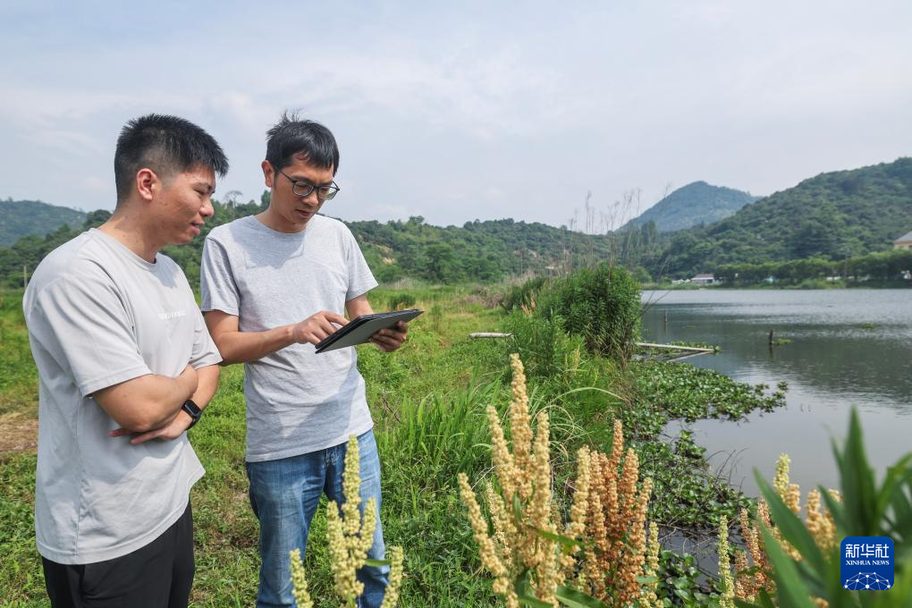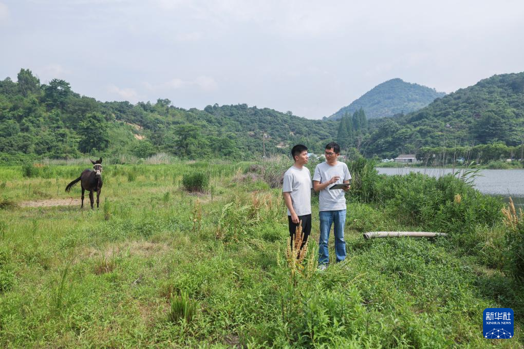 5月22日,在慈溪市桥头镇上岙湖生态湿地,乡村规划师陆金夹(右)与镇干部在商讨在区块内修建环通健身绿道、新增停车场、设置杨梅观光休憩点、健身森林防火工作站等规划,为之后作为旅游开发区块做好前期准备。