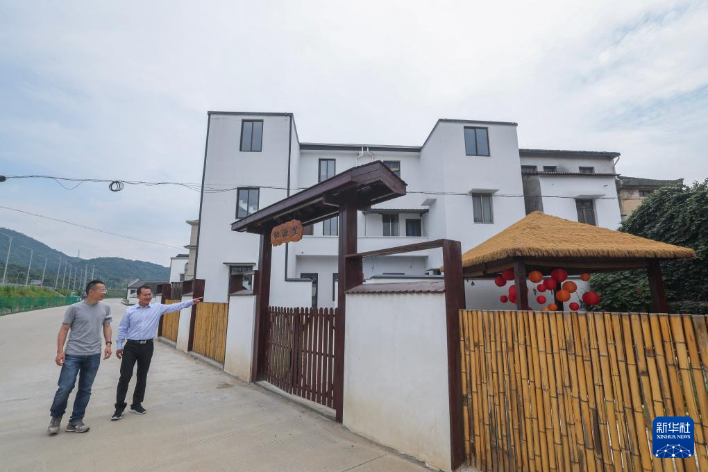 5月22日,在慈溪市横河镇彭南村,乡村规划师陈怡(右)和同事查看在乡村规划师的建议和帮助下由老旧房子改建成的彭南桃源里乡村艺术馆。