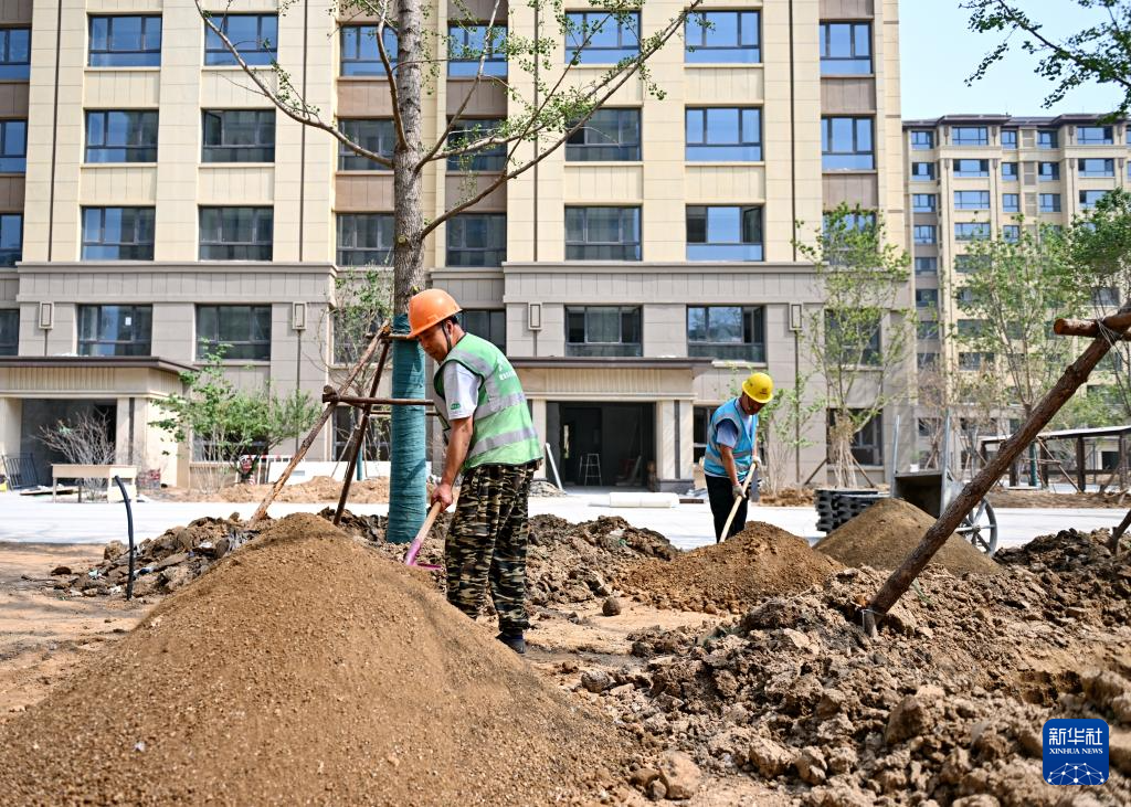 5月23日,中铁二十局集团建设者在雄安新区容西片区安置房二期项目内进行绿化作业。