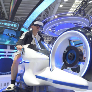 5月23日,观众在现场体验光速飞轮VR摩托竞速大型体感游戏机。