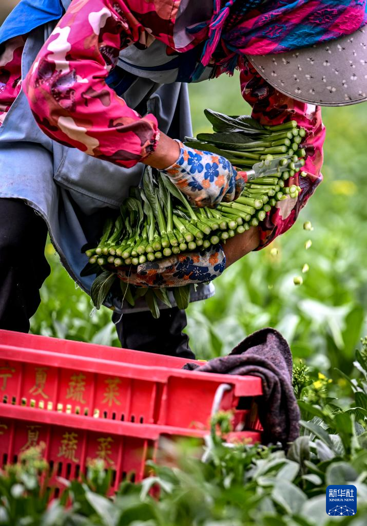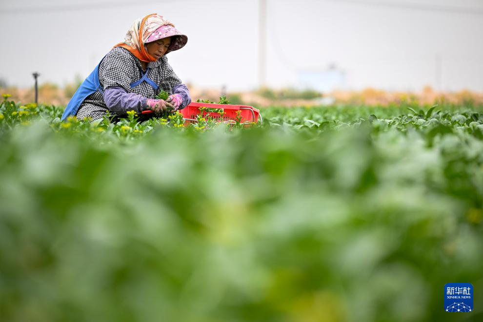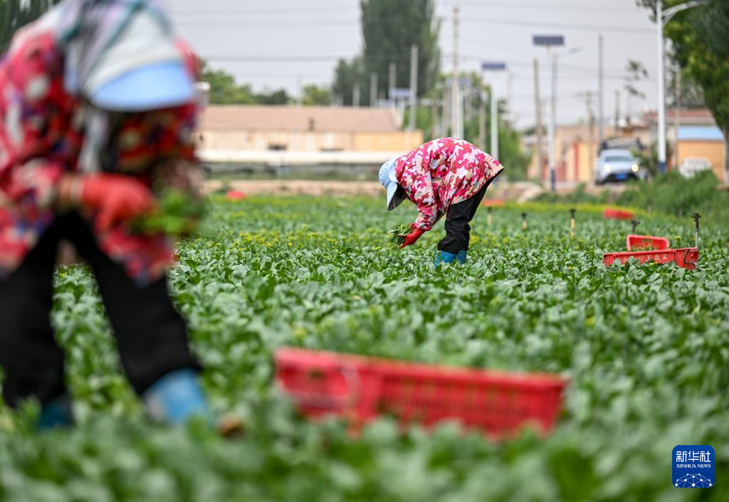5月24日,工作人员在宁夏贺兰县立岗镇银星村一冷凉蔬菜种植基地采摘菜心。